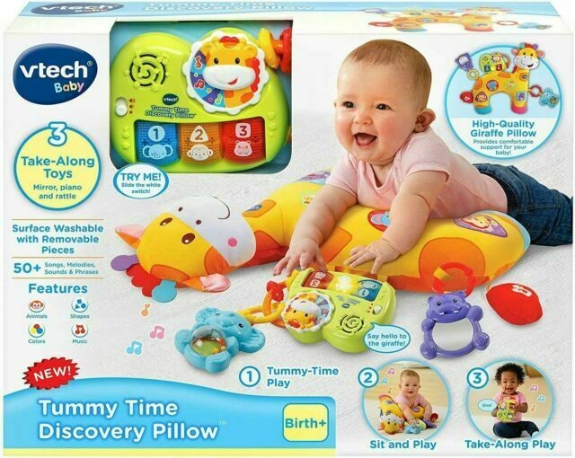 Bébé se met à l'aise en jouant à plat ventre avec Mon coussin d'éveil musical de VTechMD. En plus d'offrir un excellent soutien à votre bébé, cet oreiller extrêmement moelleux à l'effigie d'une gentille girafe propose aussi trois modes de jeu. L'oreiller en forme de croissant procure à la nuque de votre tout-petit un soutien exceptionnel quand il joue à plat ventre et commence à renforcer les muscles de son cou. De plus, il offre à bébé un excellent soutien pendant qu'il apprend à s'asseoir seul. Au fur et à mesure qu'il grandit, l'oreiller est l'article idéal pour jouer quand il est en voyage d'auto. Avec ses divers motifs et ses nombreuses textures et couleurs, l'oreiller procure à bébé une très bonne stimulation visuelle et tactile. Les touches de piano lumineuses se trouvant sur le piano amovible présentent à votre enfant les chiffres, les couleurs, les formes et les animaux, puis jouent des comptines qu'il peut chanter en choeur, ainsi que de la musique et des chansons brèves. De plus, le miroir amovible incassable et le hochet sont les jouets idéaux à emporter pour jouer sur la route.